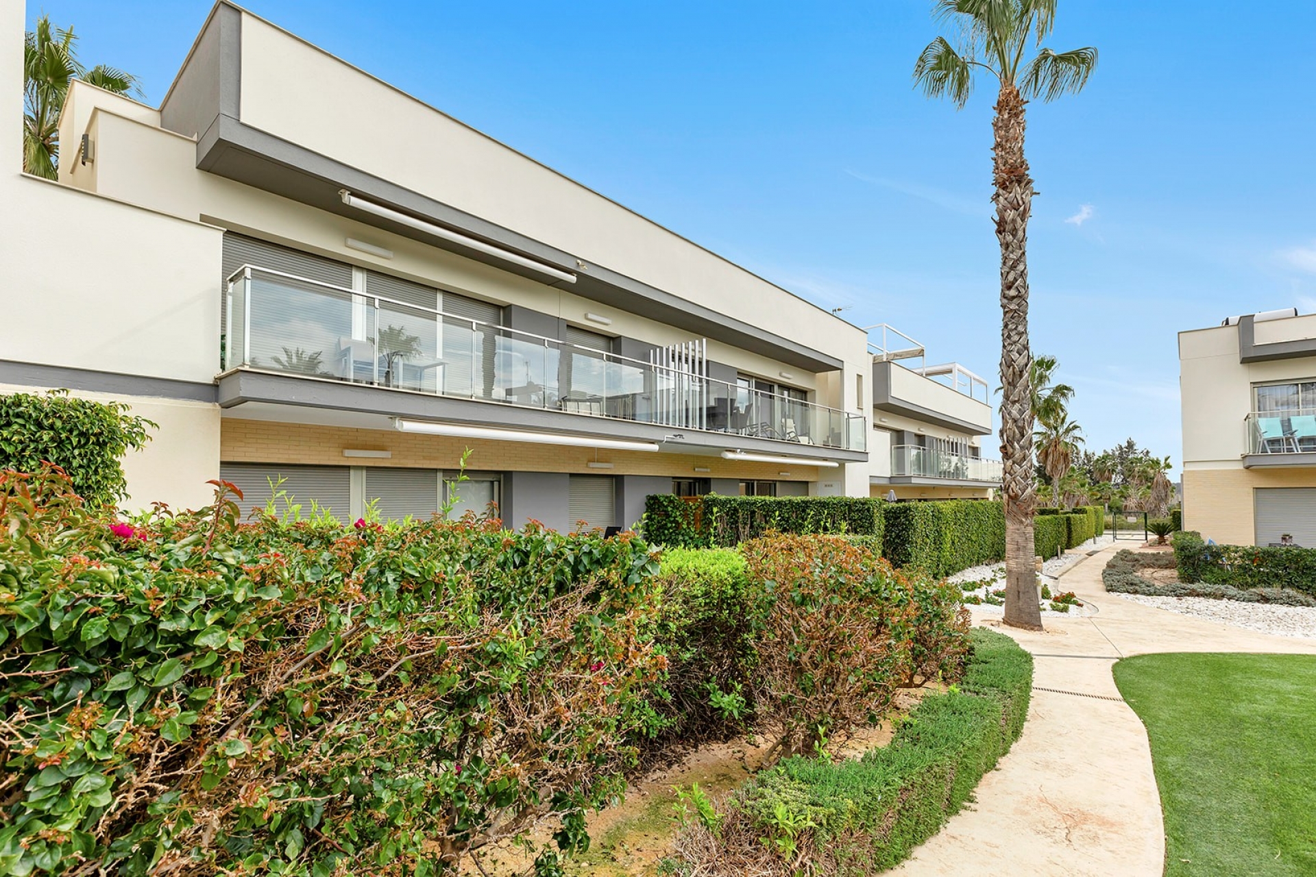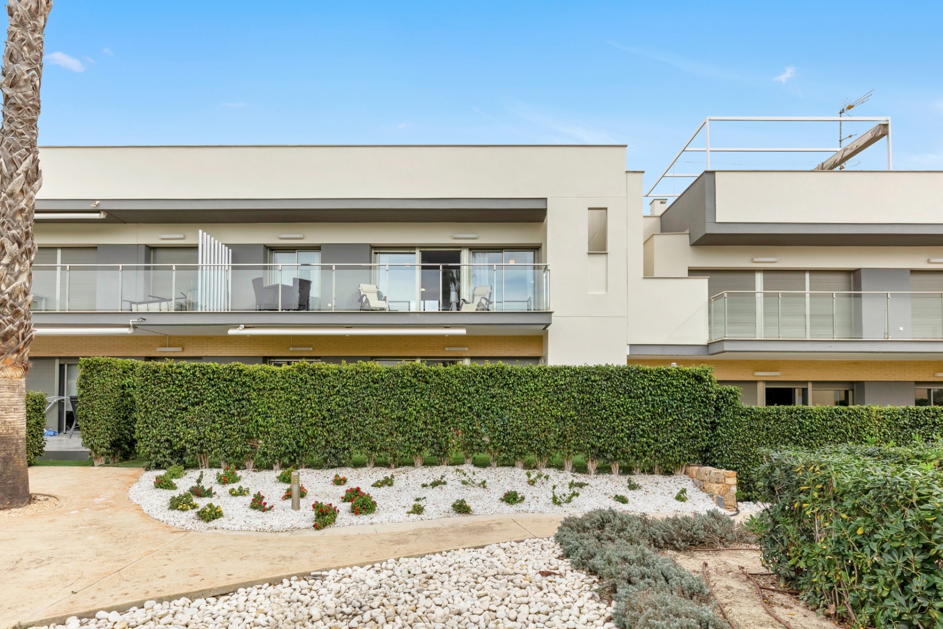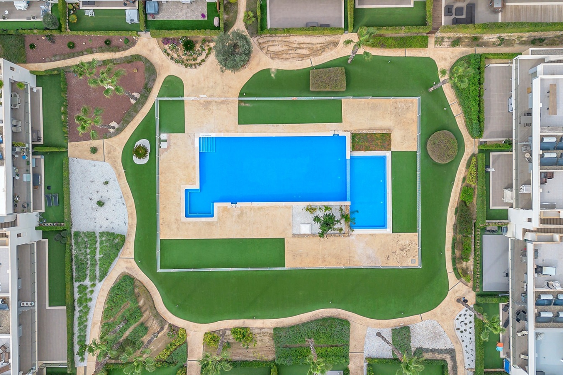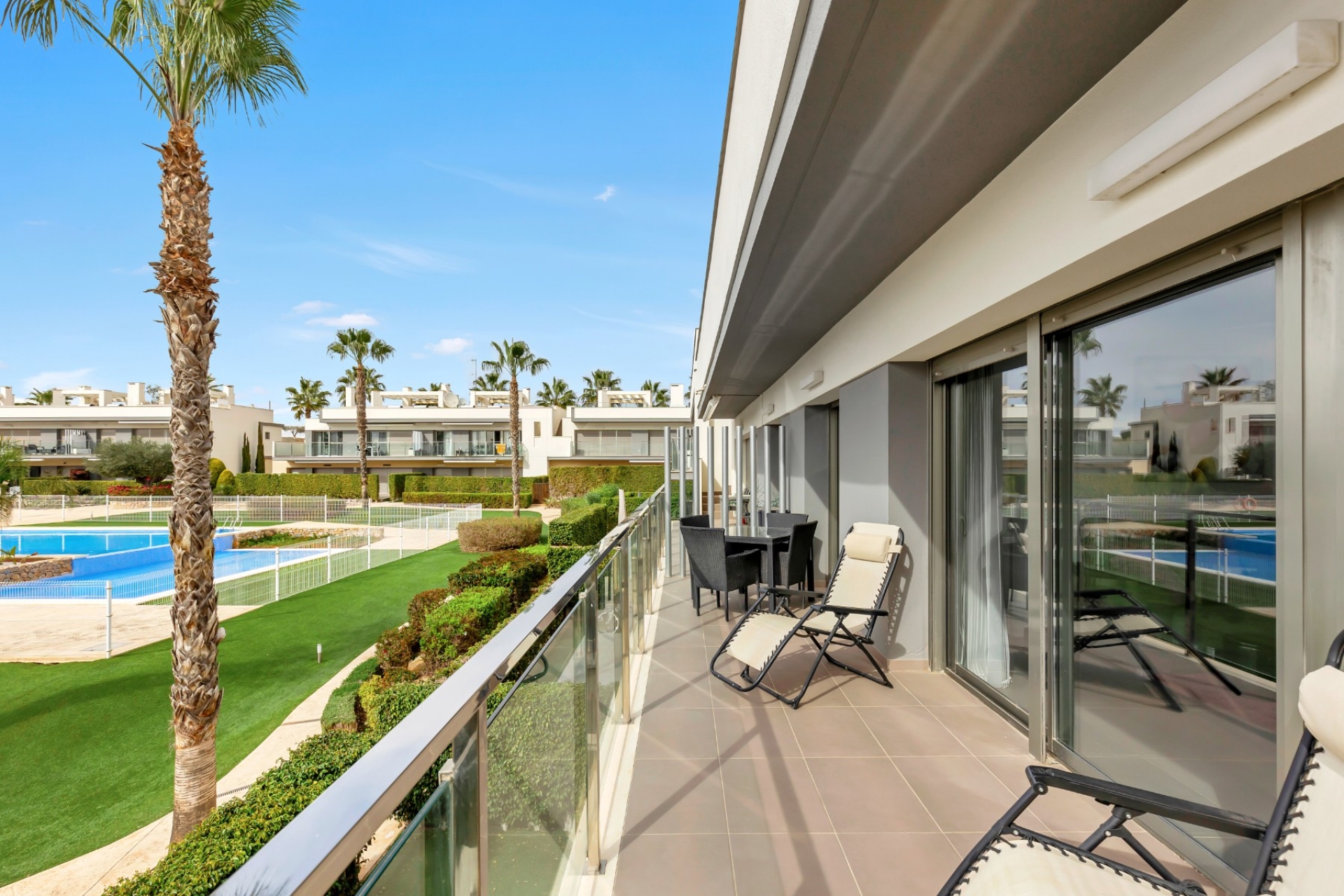 Aquí disfrutará de impresionantes vistas a la gran piscina comunitaria, ideal para relajarse y tomar el sol mediterráneo.