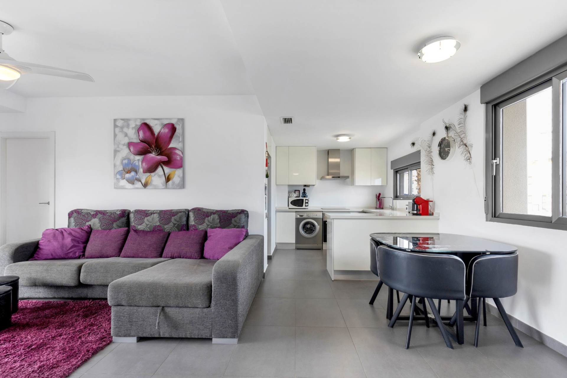 La cocina americana está totalmente equipada y se integra perfectamente en el luminoso salón, que ofrece acceso directo a la amplia terraza y a la azotea con pérgola.