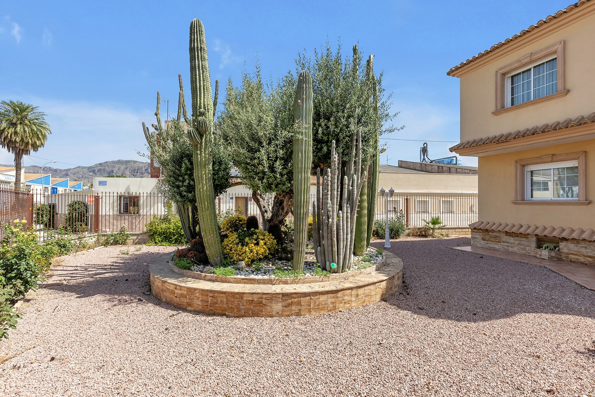 El exterior de la vivienda está rodeado por un jardín paisajístico con cactus, palmeras mediterráneas y detalles en piedra natural, ofreciendo bajo mantenimiento sin renunciar al estilo. Un entorno ideal para instalar una piscina, zona chill-out o comedor al aire libre.