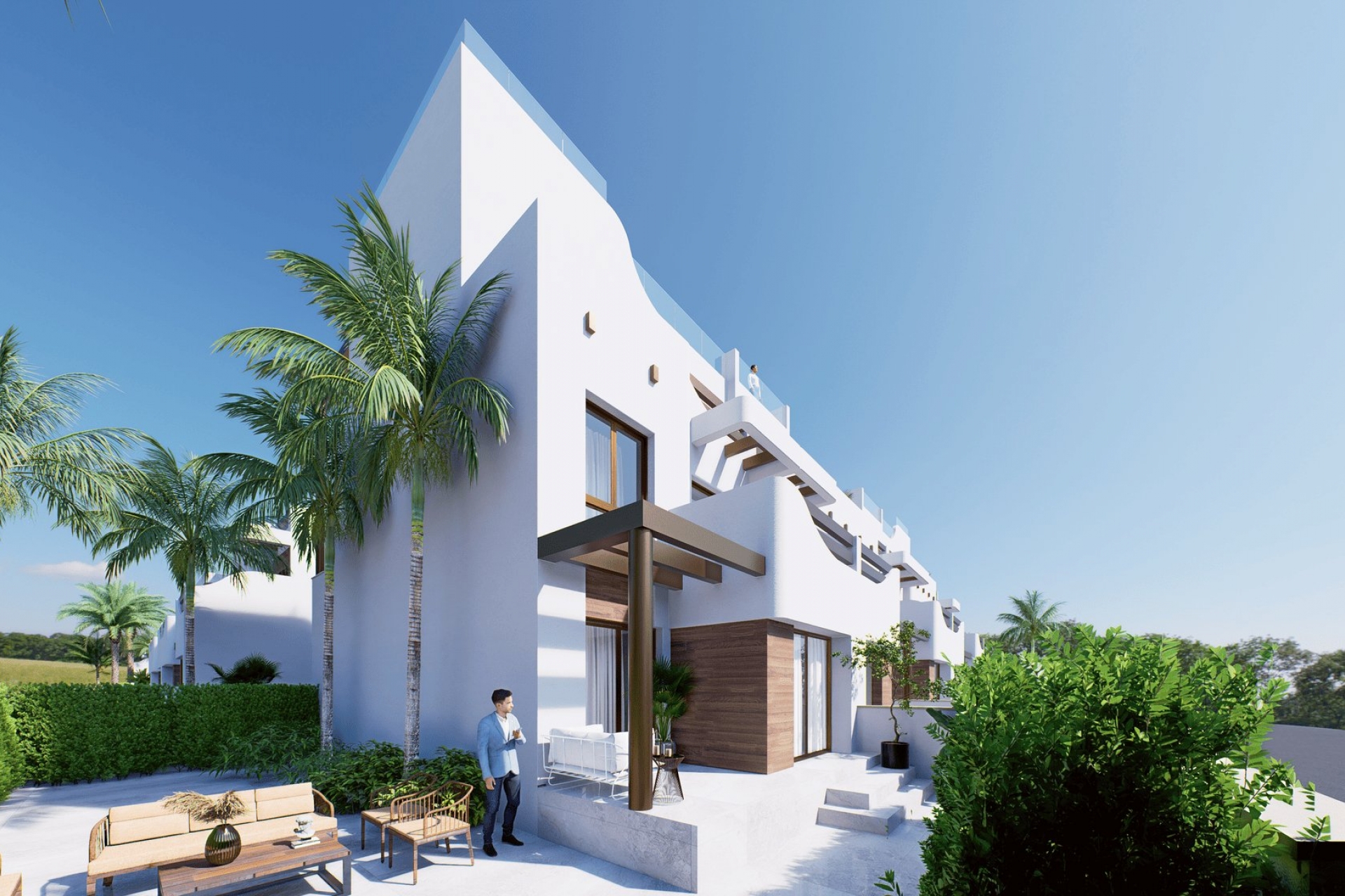 Los espacios exteriores de estas propiedades están diseñados para la relajación y el disfrute bajo el sol. Cada bungalow cuenta con su propio jardín privado—ideal para crear su oasis personal—y amplias terrazas perfectas para cenar al aire libre o relajarse al sol. Algunas unidades cuentan con un solarium que ofrece espacio adicional para tomar el sol o disfrutar de vistas panorámicas. Elegantes pérgolas añaden estilo y funcionalidad a estas áreas, haciéndolas utilizables en cualquier momento del día. Situado a solo 150 metros de la costa, siempre estará acompañado por el suave sonido de las olas.