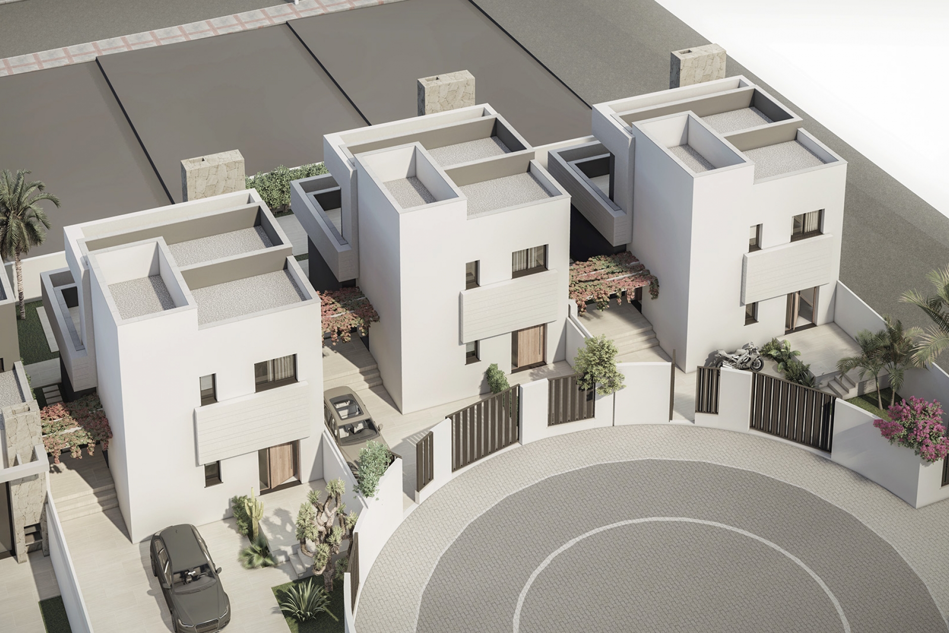 Los exteriores de estas viviendas han sido cuidadosamente diseñados para ofrecer un espacio de vida al aire libre que complementa el entorno natural de San Juan de los Terreros. Cada chalet cuenta con un jardín privado, ideal para disfrutar de momentos de ocio al aire libre. Además, las propiedades incluyen una terraza y un solárium, proporcionando múltiples opciones para relajarse bajo el sol o disfrutar de las vistas al mar. La inclusión de una piscina privada en cada vivienda añade un toque de lujo y exclusividad, permitiendo a los residentes disfrutar de un refrescante baño en la comodidad de su hogar.