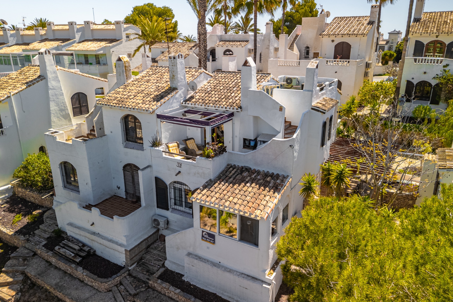 Atención amantes del golf: Este chalet pareado en Urb. Fortuna está situado en una excelente zona, cerca del campo de golf y de una amplia variedad de servicios. La propiedad ofrece 118,8 m² de vivienda distribuidos en dos plantas. Estas viviendas cuentan con una distribución poco común, con los dormitorios situados en la planta baja junto con dos habitaciones dobles, dos baños, un cuarto de lavandería con sauna y acceso a un invernadero. La zona de estar principal se encuentra en la planta superior, ofreciendo excelentes vistas a los alrededores. En este nivel hay un luminoso salón-comedor, una cocina americana con barra de desayuno y un aseo de invitados. Desde aquí también se accede al balcón y al solárium privado, ambos con magníficas vistas al campo de golf de Villamartin. La propiedad se vende parcialmente amueblada y es apta tanto para vivir todo el año como para utilizarla como vivienda vacacional. Ubicada en una zona residencial tranquila, cerca de restaurantes, servicios y varios campos de golf. Contáctenos para más información.Tenga en cuenta que la comunidad ha acordado la instalación de una piscina comunitaria que actualmente se está planificando.