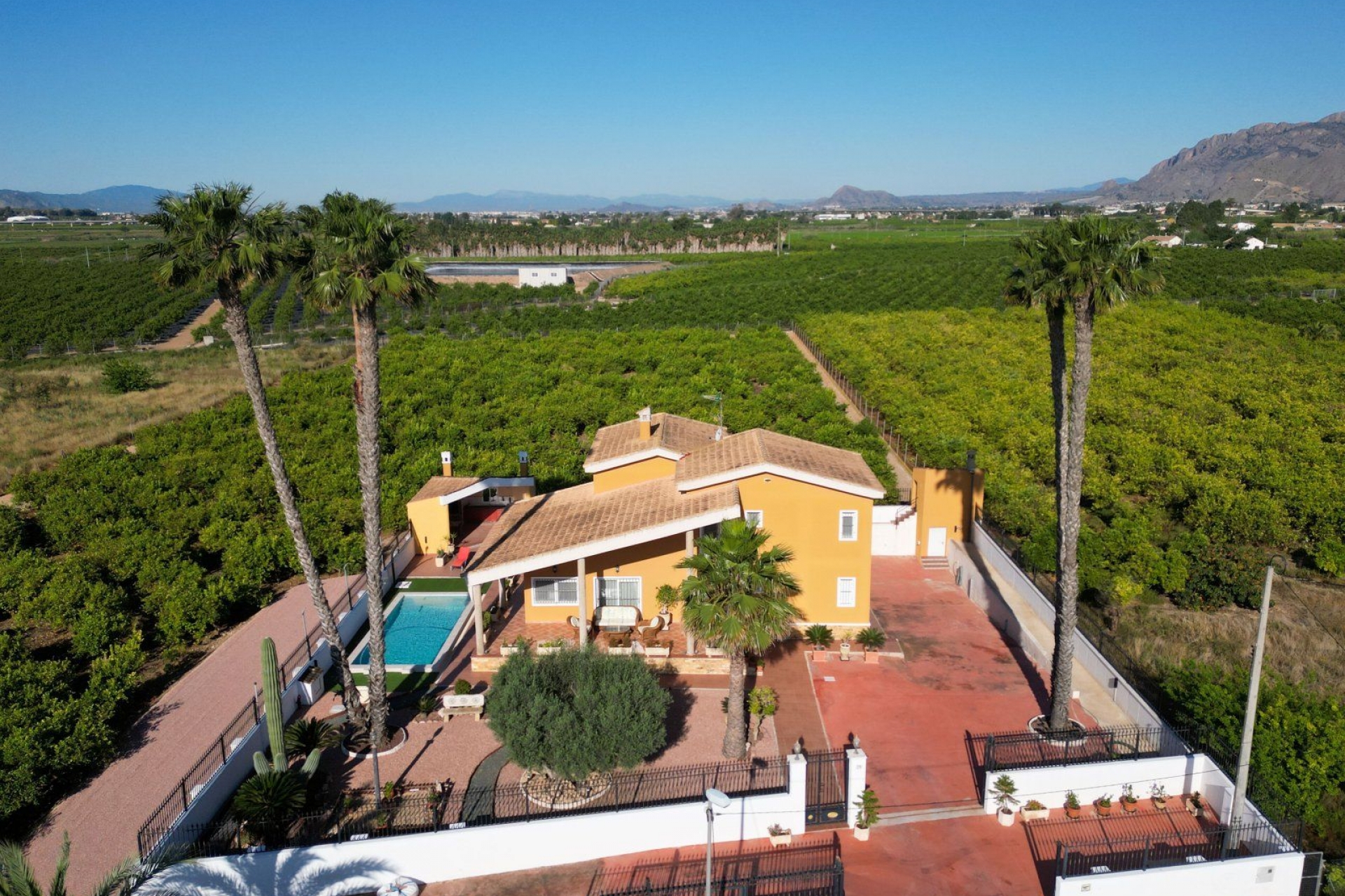 Finca de 9.480 m2. totalmente vallada con chalet de 495 m2. construidos en una parcela de 1.000 m2. vallada dentro del perímetro de la finca. La vivienda está compuesta de tres plantas: - PLANTA SEMI-SÓTANO: 224 m2. construidos Garaje para varios vehículos, gimnasio con ducha, zona de ocio, zona de bricolaje con estanterías y bancada, una habitación y un vestidor-zapatero. - PLANTA BAJA: 178 m2. construidos Distribuidos en gran salón, amplia cocina-estar independiente, despensa, zona de lavadero con puerta a terraza exterior, 1 baño con plato de ducha, 1 dormitorio con armario empotrado y un despacho con salida a terraza. - PLANTA PRIMERA: 93 m2. construidos Se distribuye en zona mirador al salón de planta inferior, habitación principal con balcón, cuarto de baño completo con bañera de hidromasaje y vestidor, 2 habitaciones (una de ellas con armario empotrado) y un baño con bañera. SERVICIOS Aire acondicionado por conductos y calefacción central con caldera por radiadores de agua en toda la vivienda. Rejas en todas las puertas y ventanas. Mosquiteras en todas las ventanas. Instalación de Fibra Óptica. Edificación con acceso desde la cocina destinada a barbacoa con fregadero y horno. Piscina y jardín. Caseta exterior con motores de aire acondicionado, caldera de calefacción y depósito de gas-oíl. Parcela de la vivienda con alumbrado. Puertas de acceso a la finca, vivienda y garaje con puertas motorizadas. La finca se encuentra plantada de limón verna en producción y con riego tradicional. Esta villa también proporciona un rendimiento anual ya que tiene limón verna en producción con riego tradicional, lo que proporciona unos ingresos anuales de entre 15.000 - 20.000 euros dependiendo del clima y de la producción de limón. LOCALIZACIÓN El inmueble se encuentra en una zona tranquila, a 5 minutos del Centro Comercial Carrefour y casco urbano de Orihuela y de Bigastro, con buenos accesos y bien comunicada, rodeada por viviendas residenciales de similares características. Cuenta con fácil acceso por carretera y en sus alrededores podemos encontrar supermercados, restaurantes y todos los servicios necesarios. M. Ext. Aluminio / M. Int. Madera Agua caliente caldera Cocina independiente equipada. Fachada monocapa Suelo rústico Orientación sureste