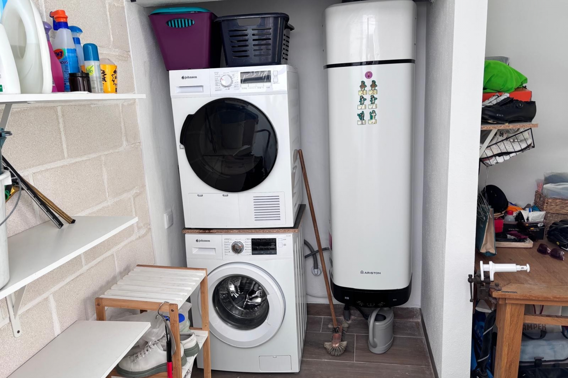 Adéntrese en esta encantadora villa cuádruple con orientación suroeste, donde la comodidad, la luminosidad y la vida práctica se combinan en perfecta armonía. Con dos dormitorios de buen tamaño, dos baños y un aseo adicional para invitados, esta casa ha sido cuidadosamente diseñada para ser ideal tanto para residencia permanente como para escapadas vacacionales relajantes. En el corazón de la propiedad, un amplio y luminoso salón invita a la relajación, con una fluida conexión con la cocina de planta abierta, totalmente equipada con electrodomésticos, creando un espacio sociable y acogedor, ideal para recibir a familiares y amigos. Los grandes ventanales permiten la entrada de luz natural durante todo el día, realzando el ambiente cálido y acogedor. En el exterior, la villa sigue impresionando. La parcela privada cuenta con un cómodo aparcamiento exterior con cochera, además de un práctico trastero y un cuarto de servicio/lavadero independiente, garantizando funcionalidad sin renunciar al estilo. El espacio exterior ofrece un excelente potencial, con amplio espacio para construir su propia piscina privada, perfecta para disfrutar al máximo del clima soleado. Se ha tenido en cuenta la comodidad, con mosquiteras en todas las ventanas y puertas de la terraza, así como persianas eléctricas que aportan un toque moderno y practicidad diaria. Esta casa, que se vende parcialmente amueblada, ofrece una fantástica oportunidad para entrar a vivir de inmediato, dejando espacio para personalizarla a su gusto. Tanto si busca una residencia permanente, una casa de vacaciones o una inversión, esta encantadora villa lo tiene todo.