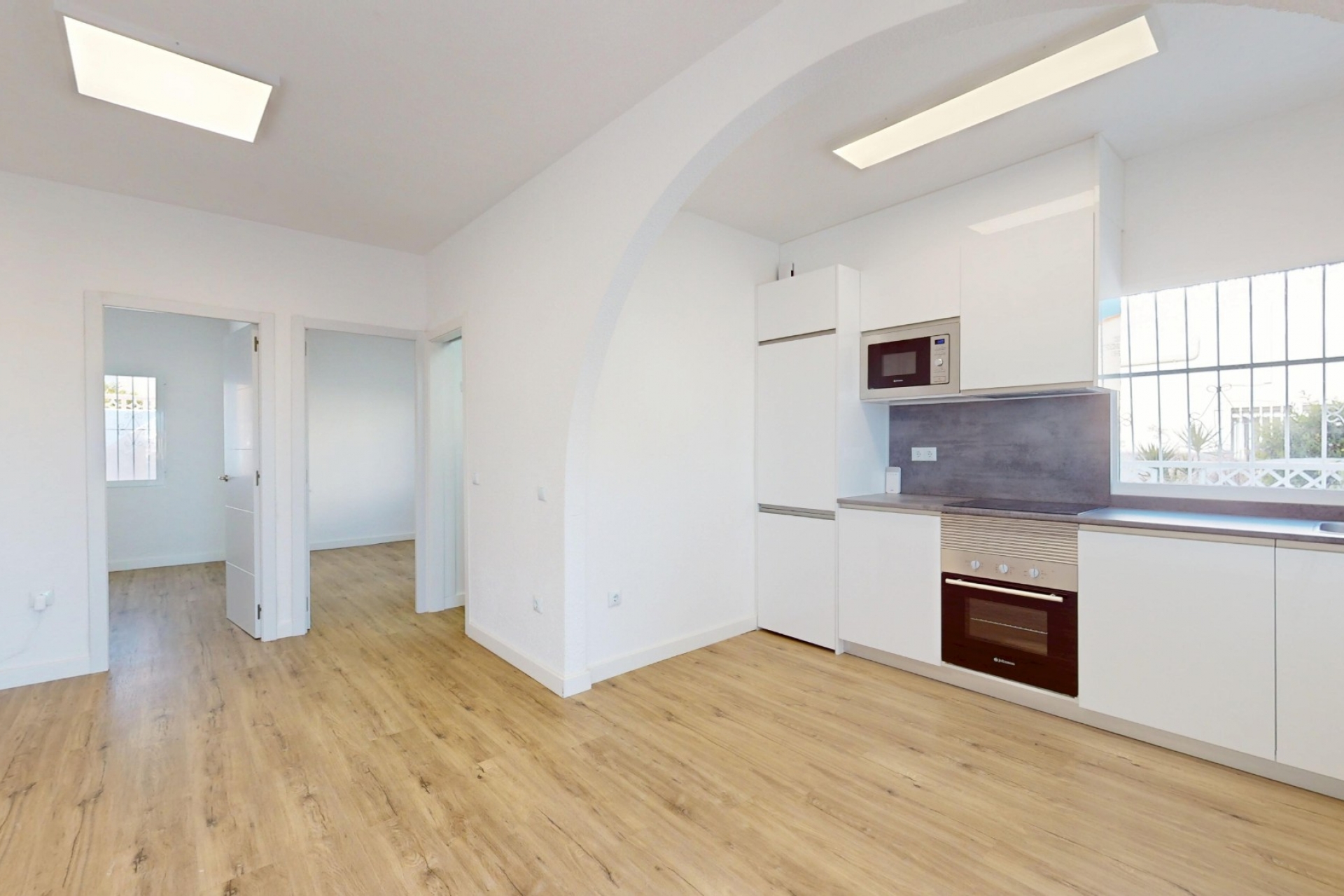 Ce bungalow de deux chambres, entièrement rénové et situé en bout de rangée à Blue Lagoon, se trouve dans un quartier résidentiel calme en bordure de Villamartin, bénéficiant d'un emplacement idéal pour les loisirs et le confort. Le mini-golf et restaurant Greenlands est à seulement 5 minutes à pied, tandis qu'une école internationale, plusieurs cafés et un supermarché sont accessibles en 10 minutes de marche. Les amateurs de golf apprécieront les trois excellents parcours situés à seulement 5 minutes en voiture, et le centre commercial La Zenia Boulevard ainsi que les superbes plages du littoral sont à seulement 10 minutes. Cette propriété, magnifiquement rénovée avec des matériaux de haute qualité, est implantée sur un terrain généreux de 202 m². La pièce de vie lumineuse et ouverte s'ouvre sur une spacieuse terrasse avant grâce à de larges portes vitrées, offrant ainsi une expérience de vie intérieure-extérieure idéale. Une élégante arche souligne la cuisine moderne équipée de meubles blancs, et la salle de douche familiale contemporaine est dotée d'une douche à l'italienne. On y trouve deux chambres doubles, chacune avec placard intégré. L'impressionnant solarium privé de 48 m², recouvert de gazon synthétique, offre un espace idéal pour se détendre ou recevoir. Le jardin paysager entoure la propriété sur trois côtés et est agrémenté de gazon synthétique, de zones de galets et de plantations attrayantes. Il offre suffisamment d'espace pour y ajouter une piscine privée si vous le souhaitez. Parmi les autres atouts, on trouve une buanderie et un espace barbecue dédié, idéal pour profiter pleinement de la vie en plein air sous le climat méditerranéen. Situé sur la très prisée Costa Blanca Sud, ce superbe bungalow entièrement rénové est parfait comme résidence principale, maison de vacances ou investissement locatif. Il offre confort, style et un emplacement exceptionnel.