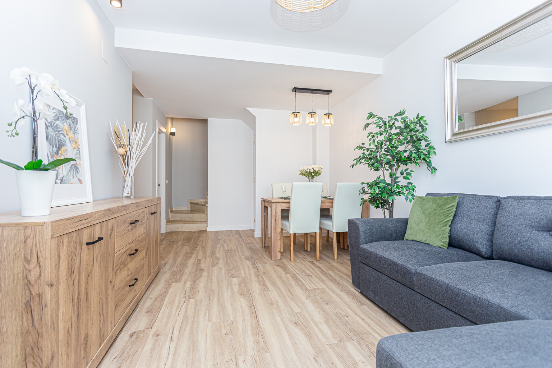 Nous vous proposons cette superbe maison mitoyenne d’angle, entièrement rénovée avec des matériaux de haute qualité et un grand soin du détail, située dans la paisible et prisée résidence Los Naranjos à Los Altos – Orihuela Costa. La propriété est en excellent état, prête à emménager, répartie sur deux niveaux avec 3 chambres et 2 salles de bains complètes. L’entrée se fait par un jardin privé entièrement carrelé, parfait pour profiter du climat méditerranéen sans entretien. Quelques marches mènent à un porche couvert, idéal pour aménager un coin salon extérieur. Le rez-de-chaussée offre un salon-salle à manger lumineux en L, intelligemment transformé pour inclure une chambre supplémentaire, parfaite pour les invités ou les personnes à mobilité réduite. On y trouve aussi une cuisine indépendante entièrement équipée, une buanderie, une salle d’eau avec douche et un espace de rangement sous l’escalier. À l’étage, deux grandes chambres doubles avec armoires indépendantes, et une seconde salle de bains avec baignoire. La chambre principale est orientée plein sud et bénéficie d’une lumière naturelle abondante toute la journée. La maison est climatisée dans toutes les chambres et le salon, et vendue entièrement meublée avec des meubles de qualité et tous les équipements nécessaires (à l’exception des effets personnels et éléments décoratifs). La résidence dispose d’une belle piscine communautaire, et la propriété est située dans une rue calme avec stationnement facile. Emplacement idéal : À 400 m du supermarché ConsumÀ proximité de restaurants tels que Asia Kitchen, un restaurant de viande sur pierre, et le pub The BridgeÀ 15 minutes à pied du centre commercial Punta MarinaÀ seulement 2,5 km de la plage de Punta Prima Parfait comme résidence principale, maison de vacances ou investissement locatif clé en main. Une opportunité à ne pas manquer sur la Costa Blanca !