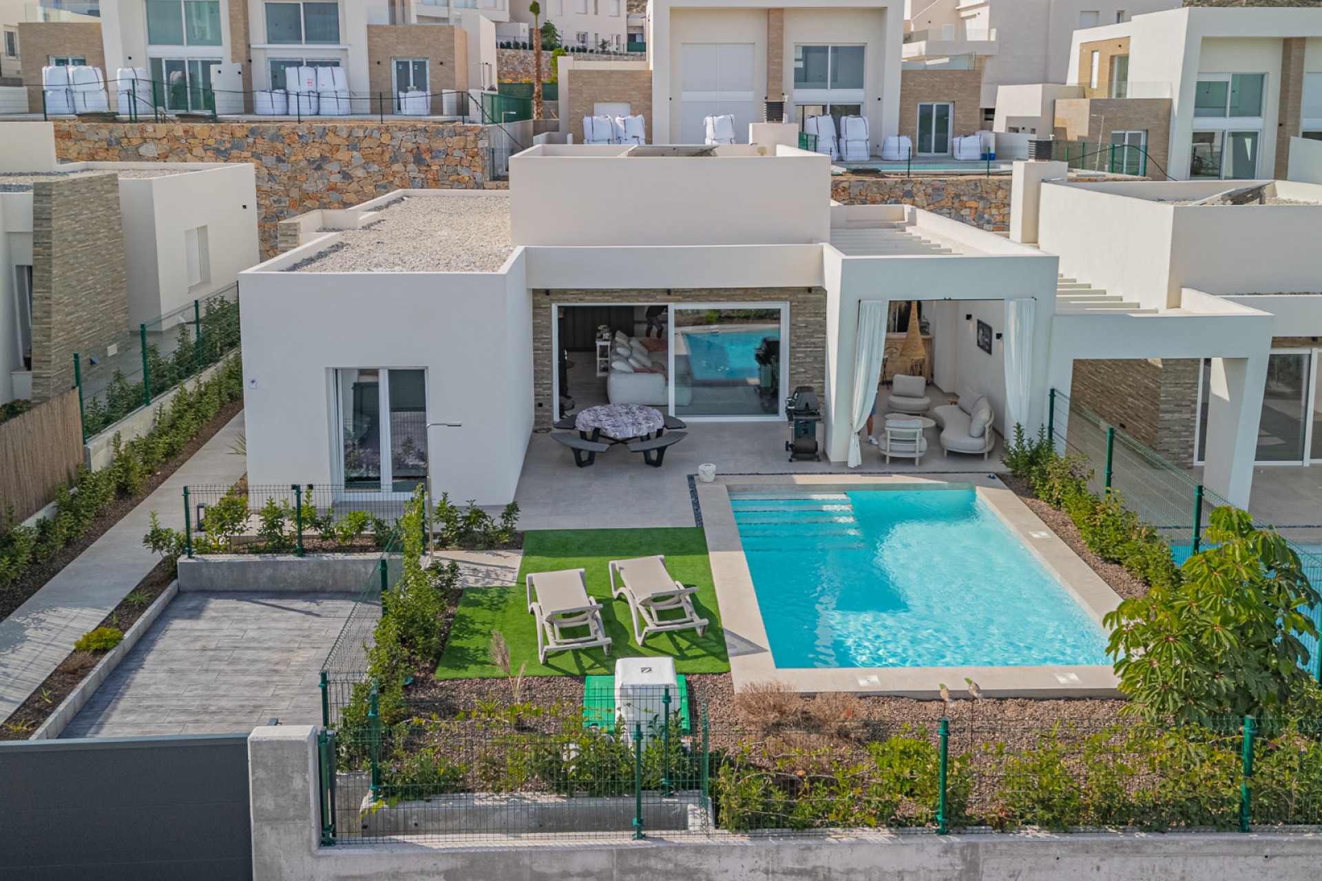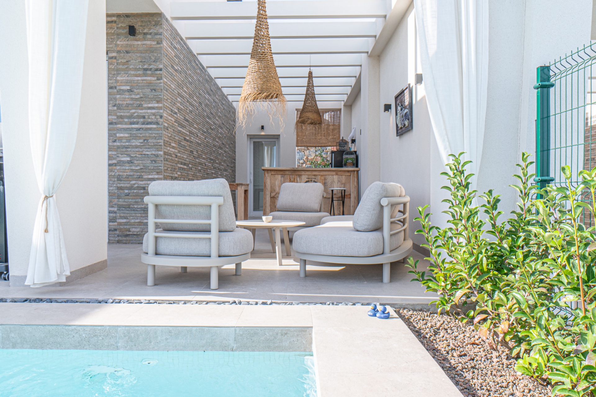 Nous sommes ravis de vous présenter cette superbe villa de luxe avec vue panoramique, grâce à sa position surélevée au golf 5 étoiles La Finca. Cette propriété moderne est un excellent exemple d’une revente quasi neuve, prête à emménager, avec de nombreuses finitions haut de gamme. Elle offre un vaste salon-salle à manger lumineux, bien plus spacieux que la moyenne, parfait pour se détendre ou recevoir. La grande cuisine ouverte, de style contemporain, dispose de meubles intégrés jusqu’au plafond, d’un grand plan de travail, d’électroménager de qualité, d’un îlot central convivial, et donne accès à une buanderie ainsi qu’à une terrasse latérale. La maison comprend trois chambres, dont une suite parentale avec accès au jardin et à la terrasse ensoleillée, un grand dressing avec miroir mural et une salle d’eau de luxe avec double vasque. Les deux chambres d’amis disposent de placards intégrés et partagent une autre salle de bain moderne. L’intérieur est décoré avec un goût raffiné, chaque détail a été choisi avec soin pour s’harmoniser avec les éléments bois et pierre, tout en apportant une touche élégante à chaque pièce. Le terrain est facile d’entretien avec une terrasse ensoleillée parfaite pour les repas à l’extérieur, ainsi qu’un coin cuisine ou bar d’été idéal pour recevoir. La villa dispose également d’une piscine privée, d’un stationnement sécurisé avec portail motorisé, et de nombreuses places libres dans la rue. Grâce à sa position dominante, la propriété offre une vue dégagée sur les montagnes et la campagne. Vendue partiellement meublée, elle inclut de nombreux extras comme l’électroménager intégré, la climatisation, les volets et portail motorisés. Située à seulement 200 mètres de l’hôtel et spa La Finca Golf, cette villa est parfaite pour les amateurs de golf, les séjours prolongés ou une résidence principale. À moins de 3 km du village d’Algorfa, typiquement espagnol, avec ses restaurants, bars et commerces, ainsi que du centre commercial La Finca réputé pour ses bons restaurants et bars à cocktails. Les plages de Guardamar del Segura, La Mata et Torrevieja ne sont qu’à 17 km. Une villa à visiter absolument pour en apprécier tout le charme. Contactez-nous dès aujourd’hui pour organiser une visite.