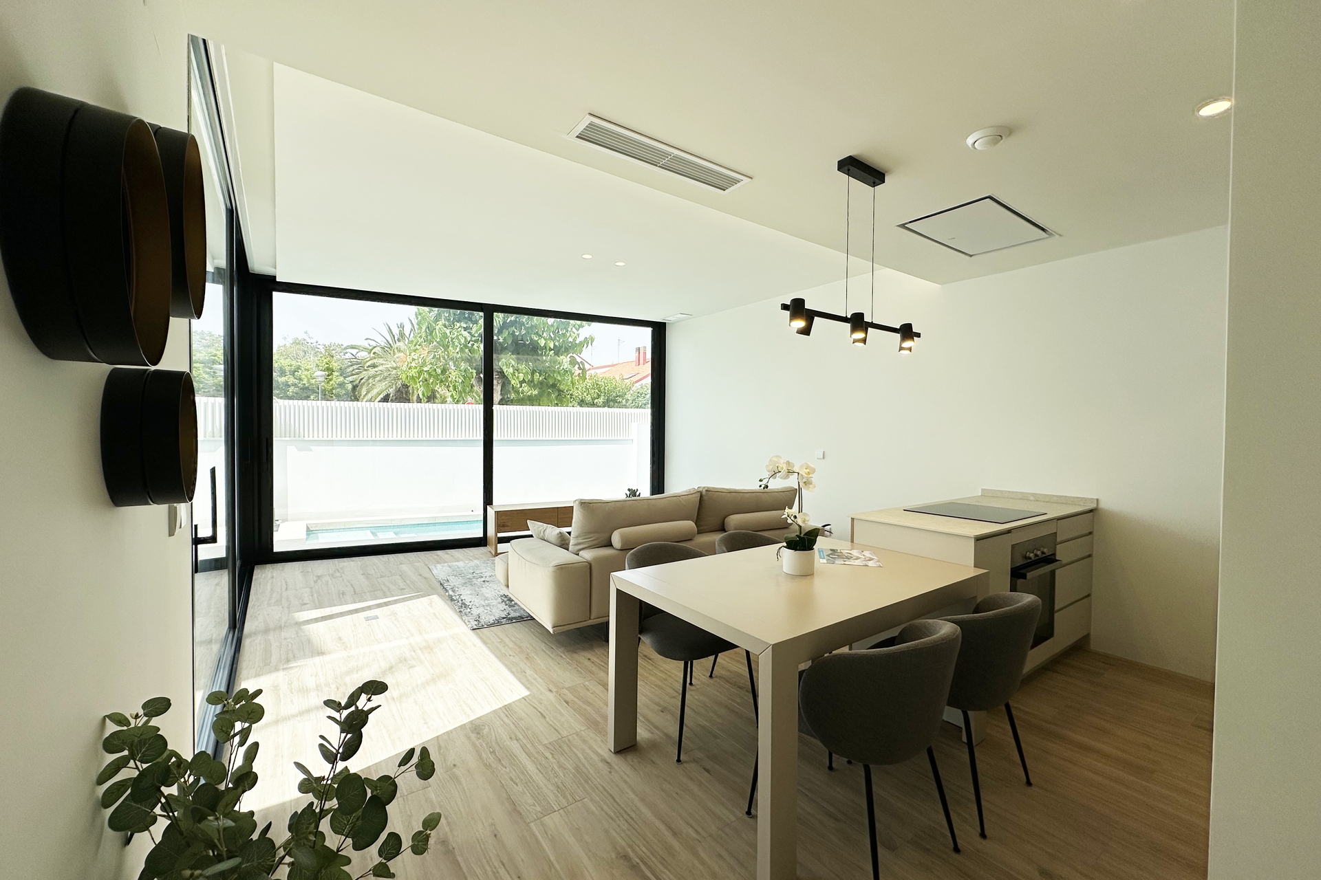 Inside these detached homes at Torre de la Horadada, every detail is crafted to maximize comfort and functionality. Modern ceramic floors ensure easy maintenance while air conditioning keeps your environment pleasant throughout all seasons. High-quality appliances simplify daily tasks and enhance your living experience. Built-in wardrobes offer generous storage space to keep your home organized and tidy. Furthermore, electric blinds and a video intercom system provide added convenience and security by efficiently managing access to your property.