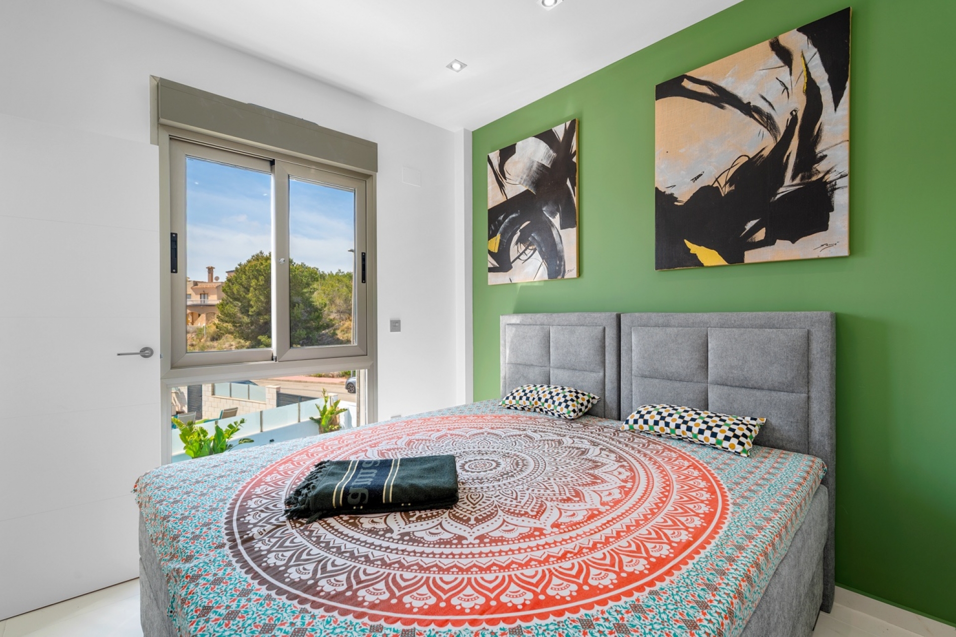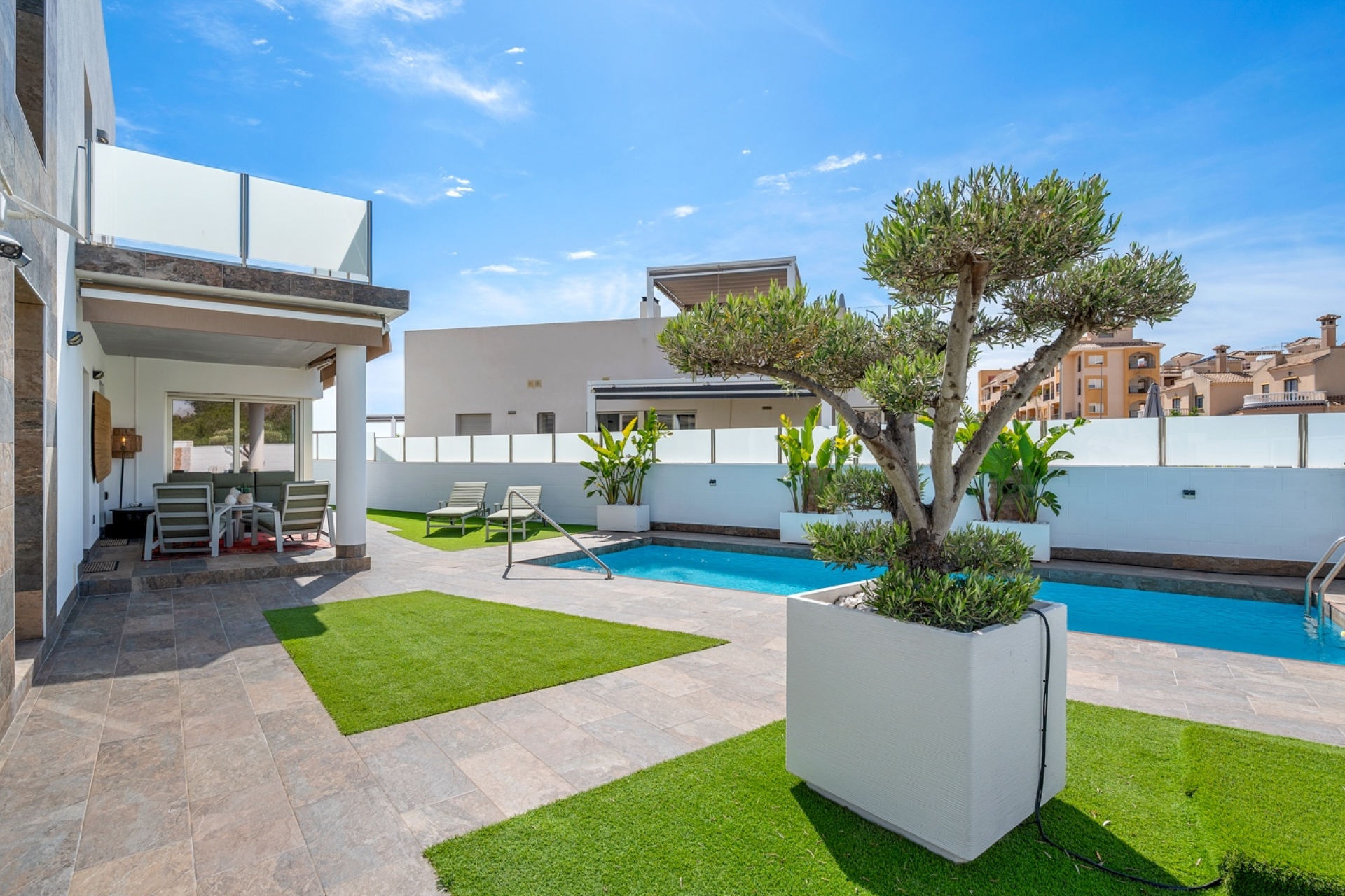 Beautiful Detached Villa in Villamartin – Orihuela Costa Fully Furnished, Heated Private Pool & Prime Location Welcome to this stunning detached villa , ideally located in the popular Villamartin neighborhood on the Orihuela Costa . This stylish home offers the perfect combination of comfort, space, and modern luxury , making it ideal as a permanent residence or a high-quality holiday home . Layout & Amenities The villa features three spacious bedrooms and two fully equipped bathrooms . The bright, open-plan living room seamlessly connects to a modern kitchen , ideal for cozy family dinners or entertaining guests. The current owners have maintained the property impeccably and are selling it unfurnished, move-in ready, and finished to perfection. If desired, the new high-quality furniture from Bella House can be purchased (20,000€). On top you will find a sunny solarium with beautiful views , the perfect place to relax or enjoy long summer evenings. Situated on a private plot of 387 m², the villa features a low-maintenance garden , a private heated swimming pool and private parking, alarm & camera system, electric sun blinds - ultimate comfort and complete privacy. At the rear of the house is a large storage room , ideal for safely storing your golf clubs, bicycles or beach equipment . Prime location Villamartin is a well-established and popular residential area nestled between golf courses and the Mediterranean Sea . Everything you need is within easy reach: supermarkets, restaurants, international schools, pharmacies, and public transport. Within minutes, you'll find prestigious golf courses such as Villamartin Golf , Real Club de Golf Campoamor , and Las Ramblas . The popular La Zenia Boulevard , one of the region's largest shopping centers, is also nearby. The beautiful sandy beaches of Orihuela Costa – such as La Zenia , Campoamor and Playa Flamenca – are easily and quickly accessible. In summary: 3 bedrooms & 2 bathrooms Bright open living room and modern kitchen Fully furnished with luxury furniture from Bella House (excluding outdoor furniture) Private garden, heated swimming pool and private parking Large storage room for bicycles or golf equipment Located near golf courses, shops and beaches This villa offers a unique opportunity to enjoy Mediterranean living in style , in one of the best locations on the Costa Blanca. Would you like to come and enjoy the Spanish sunshine soon? Contact us today for more information or a viewing.