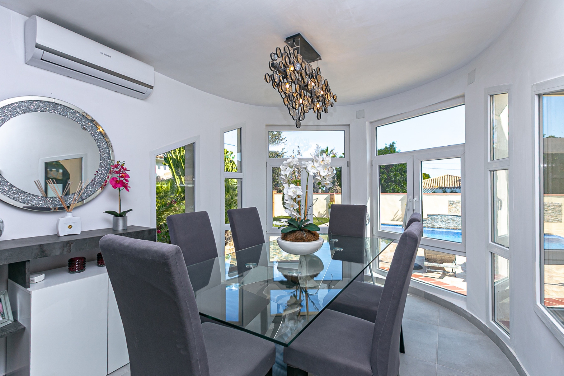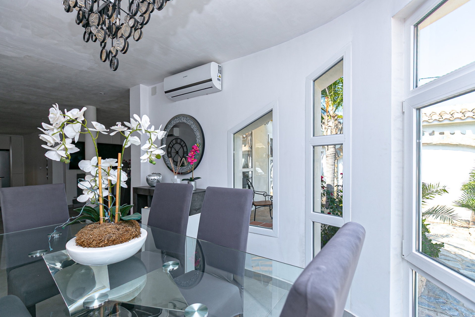 We are proud to present this detached villa located in the prestigious residential area of Lomas de Don Juan, close to Cabo Roig and the renowned beaches of Campoamor and La Zenia. This stunning single-level property has been elegantly renovated to the highest standards, combining contemporary luxury with the charm of its original Mediterranean character. Set on a generous 1,300 m² private plot, the villa offers a total built area of 344 m², surrounded by beautifully landscaped, low-maintenance gardens and complete privacy within its secure perimeter walls. Despite its peaceful and residential setting, the property is within walking distance of a variety of local amenities including restaurants, cafés, bars, supermarkets, and just minutes from several prestigious golf courses and the blue-flag beaches of the Orihuela Costa. Upon entering through a large, covered front terrace, you are welcomed into an open-plan living and dining area filled with natural light, seamlessly connected to a state-of-the-art kitchen equipped with premium integrated appliances and an American-style fridge-freezer. The villa comprises six spacious bedrooms and four modern bathrooms, including a luxurious master suite and an additional bedroom currently used as an office/sports lounge. Each bedroom features fitted wardrobes and French doors, providing direct access to the outdoor areas. The rear bedrooms enjoy beautiful views of the pool and garden and share a large bathroom with a walk-in shower and a freestanding bathtub. The interior renovation, completed in 2024, includes top-quality finishes, flooring, lighting, and fixtures throughout, ensuring both comfort and sophistication. The outdoor area is equally impressive, featuring a 9 x 6 metre private swimming pool, a stone-built gazebo with a fully equipped bar, glass curtains, and a lounge area — perfect for entertaining all year round. There is also a large retractable awning providing shade and multiple seating areas to enjoy the Mediterranean climate. Additional features include: Solar water heating system Independent air conditioning units in all rooms Gas fireplace in the main living area Alarm system and double garage Two external storage rooms Option to create an independent 2-bedroom, 1-bathroom guest apartment with its own lounge and kitchenette, ideal for guests or rental income. This property represents a rare opportunity to acquire a luxurious, move-in-ready villa in one of the most desirable locations of Orihuela Costa — combining elegance, functionality, and Mediterranean lifestyle in perfect harmony.