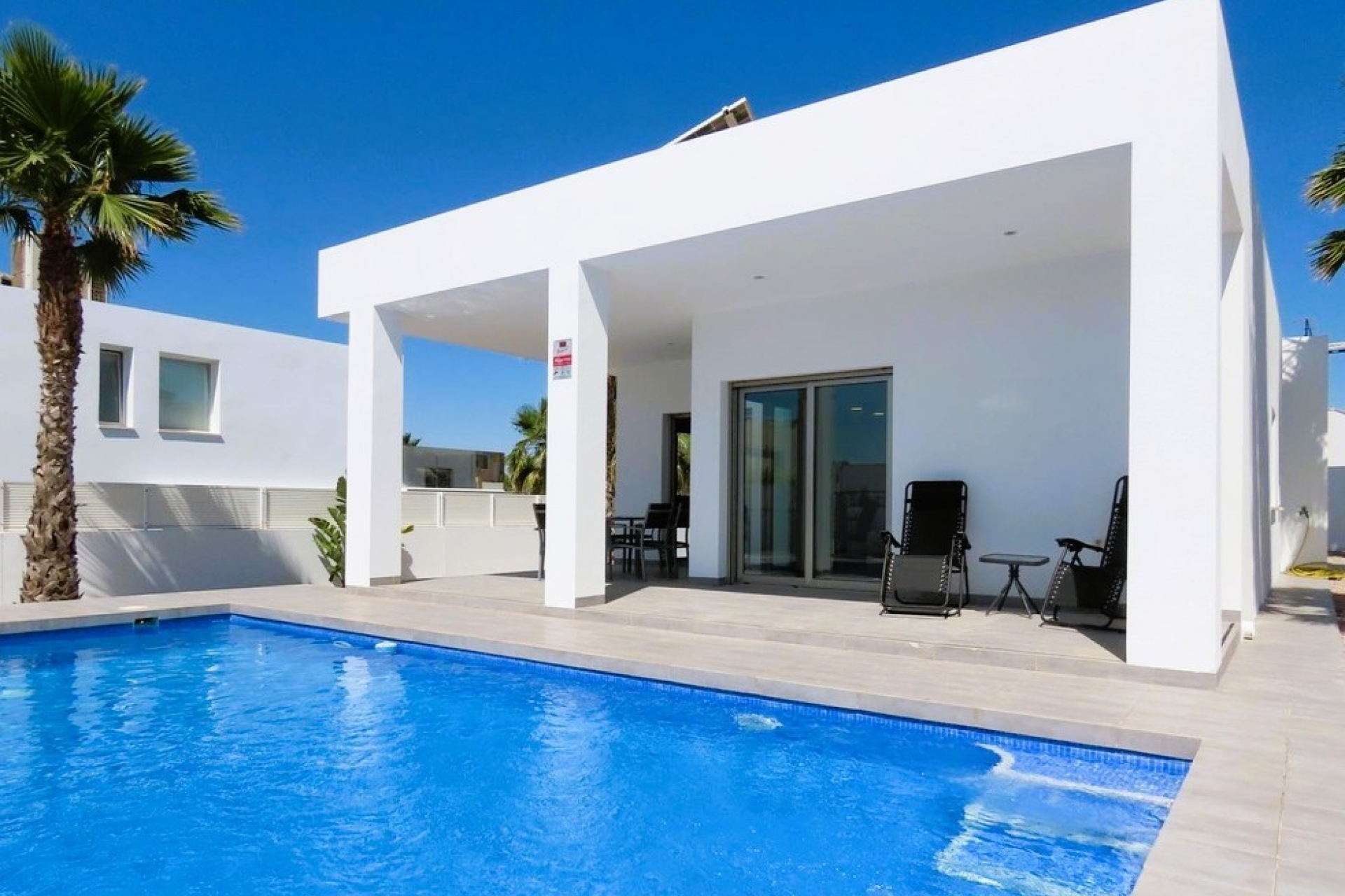 This charming detached villa is located on a 500 m² plot in the peaceful and well-established residential area of La Marina, in San Fulgencio, just 5 km from the beaches of the Costa Blanca and close to all amenities. Built in 2017, the property offers approximately 156 m² of living space, combining modern design with the warmth of Mediterranean living. Bright interior spaces Upon entering the home, you are welcomed by bright and spacious interiors with an open layout and large windows that connect the living areas with the garden and pool. The villa features: 3 bedrooms 2 bathrooms Master bedroom with en-suite bathroom and walk-in wardrobe Modern open-plan kitchen Spacious living and dining area overlooking the pool Separate laundry room The living room provides direct access to a covered terrace, ideal for relaxing or dining outdoors. Outdoor spaces The exterior areas are designed to fully enjoy the Mediterranean climate. The property includes: Private swimming pool Landscaped garden areas Parking space within the plot Its slightly elevated position offers privacy and beautiful open views. Comfort and efficiency The villa also incorporates features designed for long-term comfort and energy efficiency. These include: Solar panels, reducing energy consumption High-quality materials and finishes Excellent condition throughout Location The villa is located in La Marina, a popular residential area belonging to San Fulgencio, known for its relaxed atmosphere and close proximity to the coast. All daily services such as supermarkets, restaurants and shops are nearby. Distances Shops, restaurants and services – approx. 1 km Costa Blanca beaches – 5–6 km Alicante International Airport – 25 minutes An excellent option as a permanent residence, holiday home or investment property on the Costa Blanca. Information and viewings For further information or to arrange a viewing, please feel free to contact us. We will be happy to assist you.
