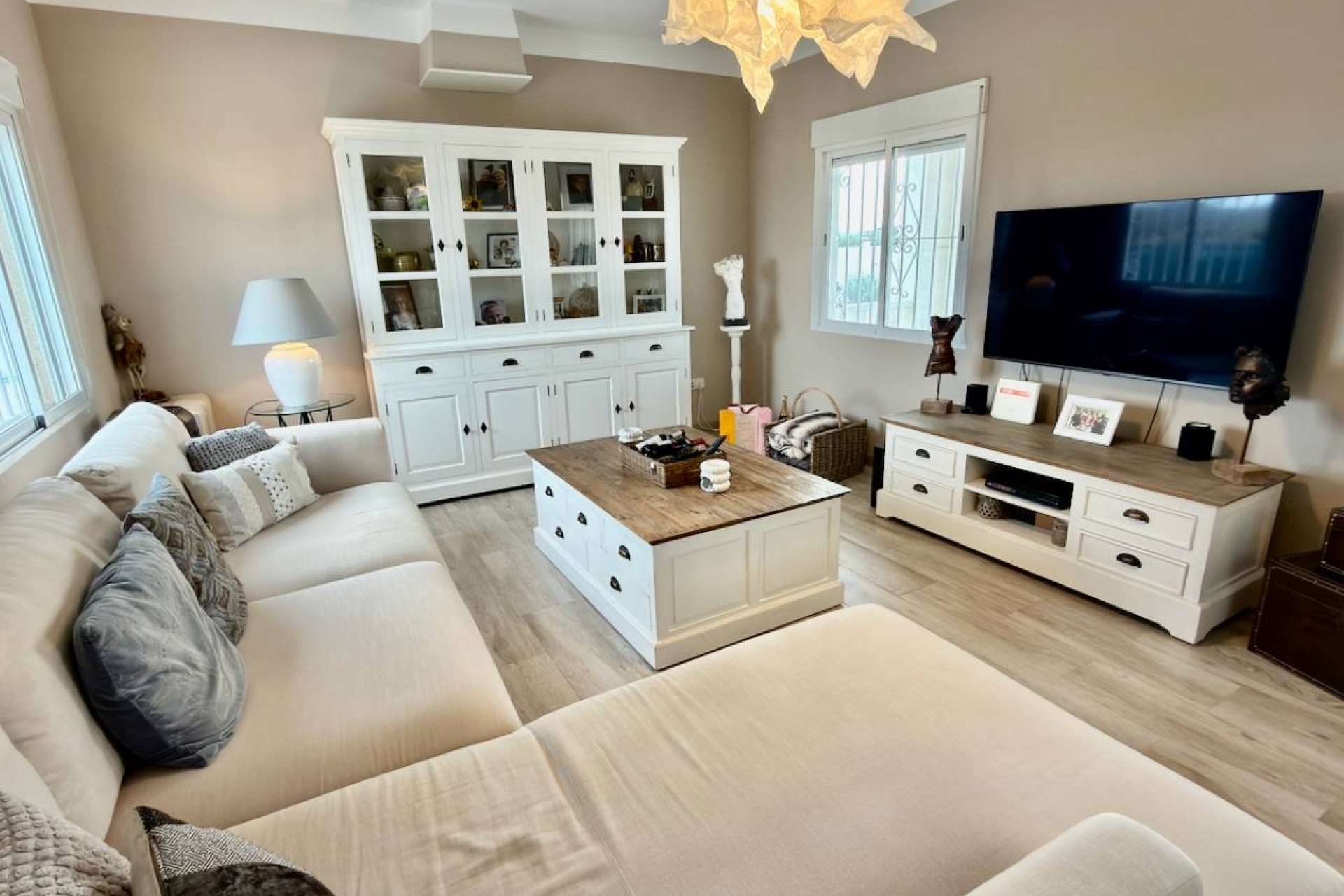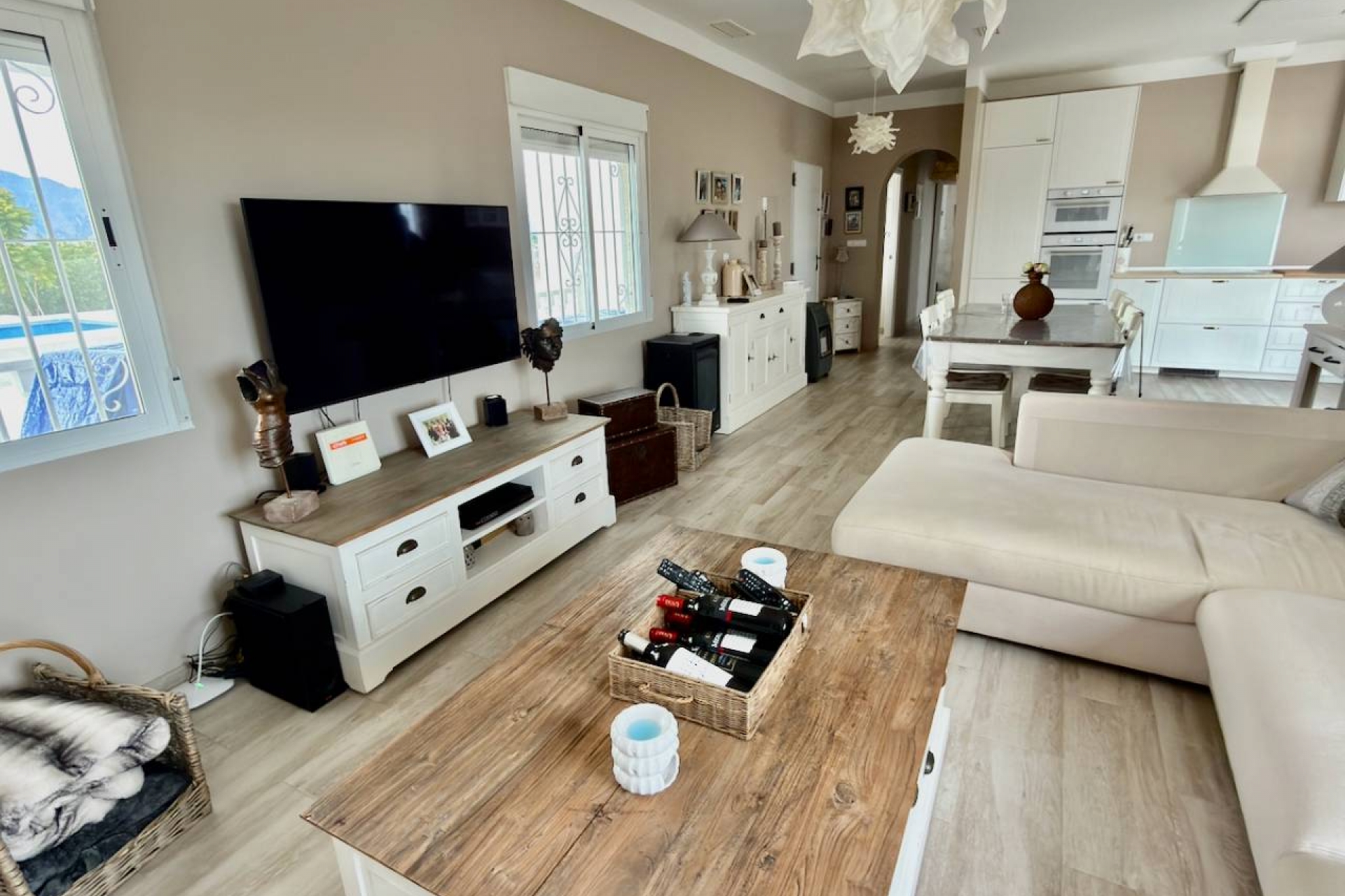 Elegant South-Facing Luxury Villa with Private Pool & Panoramic Mountain Views (Built 2015) Set within an expansive 2,800 m² private plot, this exceptional 3-bedroom, 2-bathroom villa offers a refined blend of modern design, comfort, and serene natural beauty. With 120 m² of impeccably presented living space, the property is in excellent condition and designed for effortless indoor-outdoor living. At the heart of the home lies a stunning open-plan living and dining area, seamlessly connected to a sleek American-style fully fitted kitchen equipped with quality appliances. Bathed in natural light, the living space opens out to picturesque garden and pool views, creating a calm and sophisticated atmosphere throughout. The villa features three spacious bedrooms, all with built-in wardrobes, including a beautifully appointed master suite with en-suite bathroom, offering privacy and comfort. Designed for year-round luxury living, the home includes: Air conditioning and ceiling fans throughout Solar panels for energy efficiency Advanced water filtration systemMosquito screens for added comfortSeptic TankWater deposit of 10,000 litres Outdoors, the property truly excels. The landscaped gardens surround a stunning private swimming pool, perfectly positioned to take in the breathtaking mountain views. Multiple areas for lounging, dining, and entertaining make this an ideal retreat for both relaxation and hosting, an excellent area for walks & cycling and enjoying the outdoors. Additional highlights include: Private parking for up to 4 vehiclesGarden shed for discreet storageSouth-facing orientation ensuring all-day sunshineSeptic systemFurniture negotiable for a turnkey experience Ideally located just 10 minutes from local amenities and approximately 30 minutes from the beach, airport, and golf courses, this villa offers privacy without compromise on convenience Set within an expansive 2,800 m² private plot, this exceptional 3-bedroom, 2-bathroom villa offers a refined blend of modern design, comfort, and serene natural beauty. With 120 m² of impeccably presented living space, the property is in excellent condition and designed for effortless indoor-outdoor living. At the heart of the home lies a stunning open-plan living and dining area, seamlessly connected to a sleek American-style fully fitted kitchen equipped with quality appliances. Bathed in natural light, the living space opens out to picturesque garden and pool views, creating a calm and sophisticated atmosphere throughout. The villa features three spacious bedrooms, all with built-in wardrobes, including a beautifully appointed master suite with en-suite bathroom, offering privacy and comfort. Designed for year-round luxury living, the home includes: Air conditioning and ceiling fans throughoutA stylish fireplace for уют winter eveningsSolar panels for energy efficiencyAdvanced water filtration systemMosquito screens for added comfort Outdoors, the property truly excels. The landscaped gardens surround a stunning private swimming pool, perfectly positioned to take in the breathtaking mountain views. Multiple areas for lounging, dining, and entertaining make this an ideal retreat for both relaxation and hosting. Additional highlights include: Private parking for up to 4 vehiclesGarden shed for discreet storageSouth-facing orientation ensuring all-day sunshineSeptic systemFurniture negotiable for a turnkey experience Ideally located just 10 minutes from local amenities and approximately 30 minutes from the beach, airport, and golf courses, this villa offers privacy without compromise on convenience.